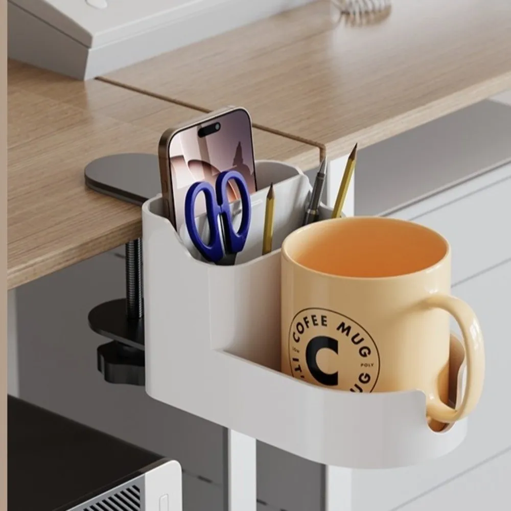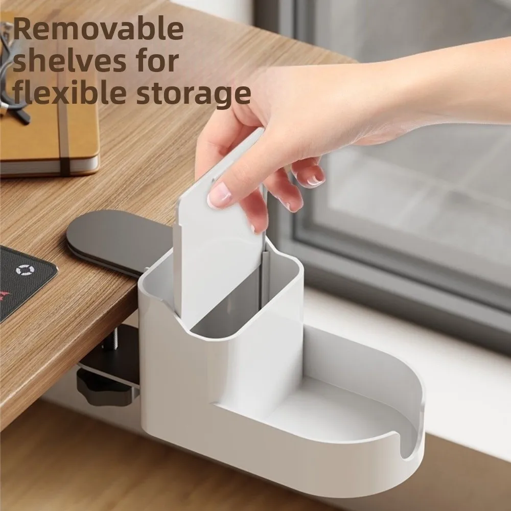 Fixation simple par pince, matériaux durables (ABS + acier), disponible en blanc minimaliste ou noir sophistiqué. L'accessoire indispensable pour un workspace campus chic où chaque chose trouve sa place naturellement.