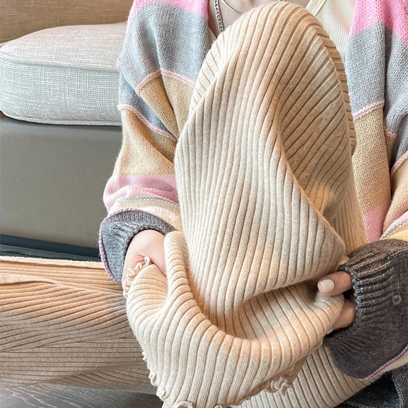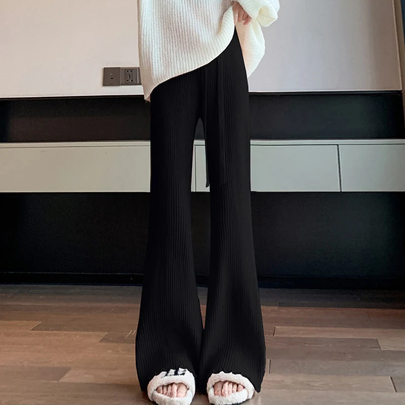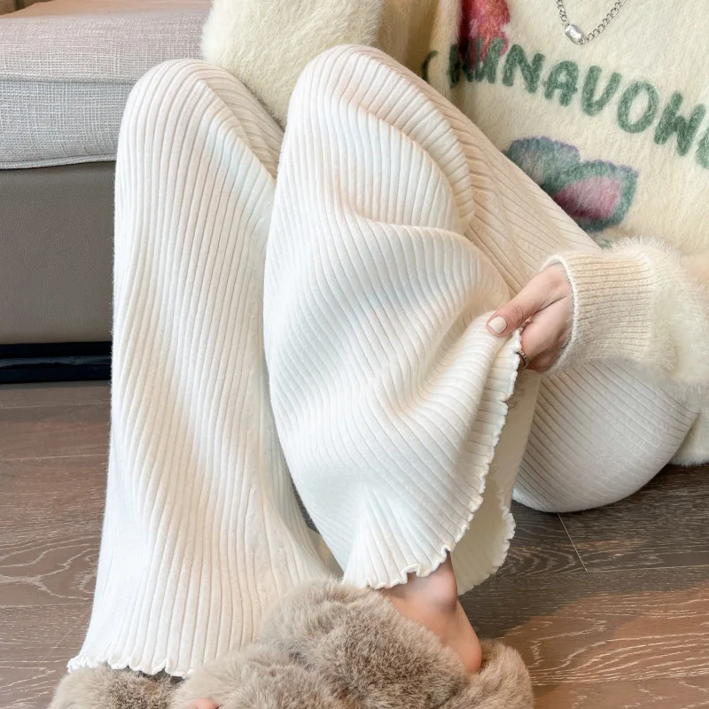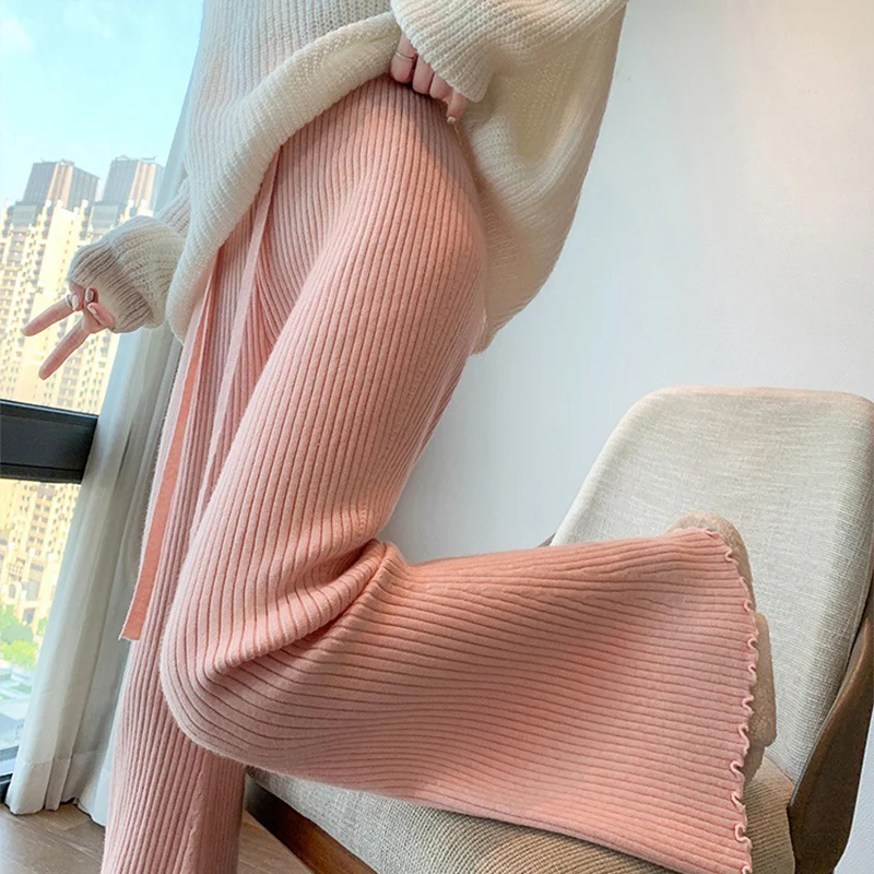 C'est le moment parfait pour enfiler ce pantalon bootcut en tricot côtelé. Sa matière douce et légèrement extensible épouse délicatement vos formes, tandis que sa taille haute vous enveloppe d'un confort absolu. Les bords volantés ajoutent cette petite touche féminine qui vous fait vous sentir belle, même en mode détente totale.